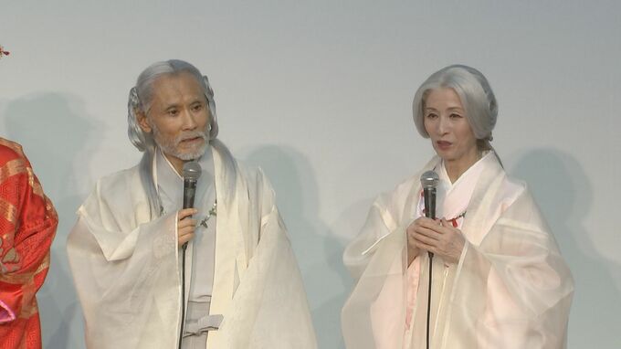 今回、イザナギノ尊役として神様を演じる片岡さんは“ヨガをやって11年。ずっと神と交信しております。今イザナミ、イザナギを演じられるのは日本では、松原さんと鶴太郎しかいないんじゃないか。そのコンビがお送りする桃太郎でございます”と、神様役に自信満々の様子でした。