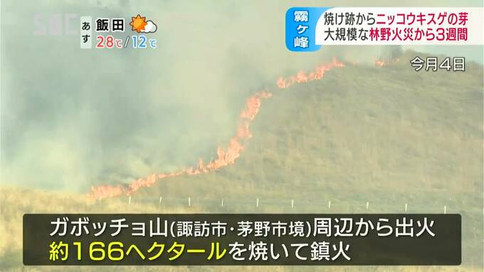 諏訪市と茅野市にまたがるガボッチョ山付近から出た火が燃え広がり、東京ドーム35個分に相当するおよそ166ヘクタールを焼いて翌日、鎮火しました。