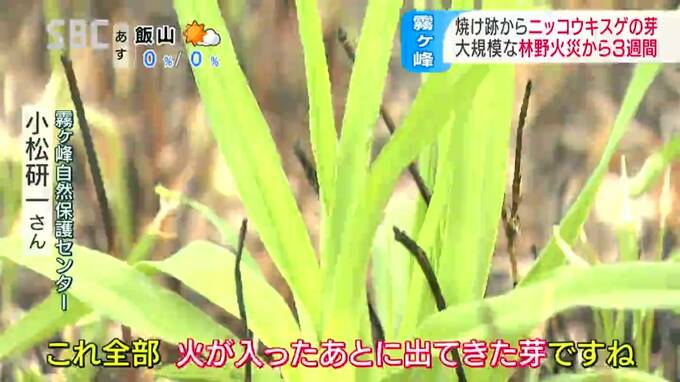 ■霧ヶ峰自然保護センター 小松研一さん 「ここが焼けたところの境 ニッコウキスゲです、火が入ったあとに出てきた芽ですね」