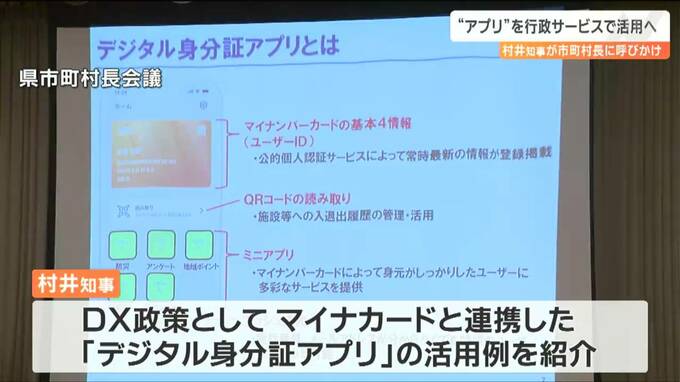26日開かれた市町村長会議で村井知事は、県が今年度から進めているDX、デジタルトランスフォーメーションの政策として、マイナンバーカードと連携したスマートフォンの「デジタル身分証アプリ」の活用例を紹介しました。