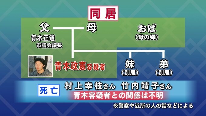 青木容疑者は、父の正道(まさみち)さん、母親、そして母親の姉であるおばと4人暮らしだったとみられます。