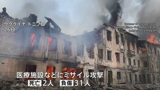 ウクライナの東部で26日、ロシア軍によるミサイル攻撃があり、30人以上が死傷しました。26日、東部ドニプロにある医療施設などがミサイル攻撃を受け、地元の検察当局によりますと、2人が死亡、31人が負傷しました…