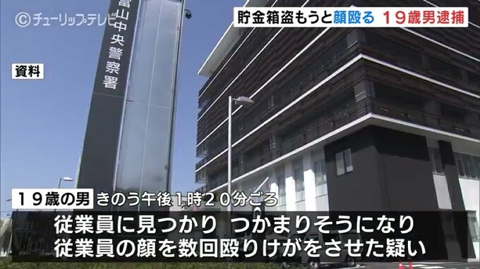 富山市内の事務所に押し入り、貯金箱を盗んだところを見つかり従業員にけがさせたとして28日、富山市の19歳の男が強盗傷害の疑いで現行犯逮捕されました。強盗傷害の疑いで逮捕されたのは、富山市の自称・無職の19…