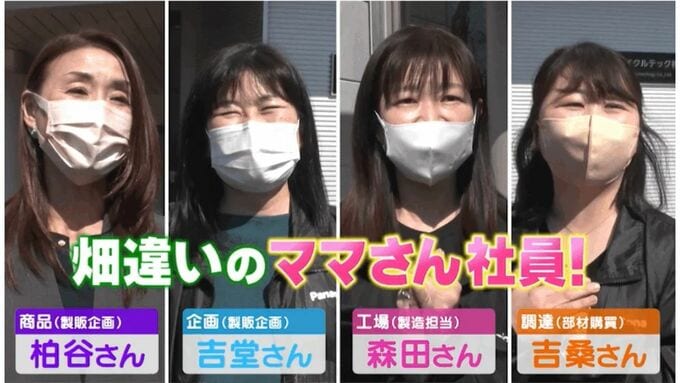 商品担当の柏谷さんと企画担当の吉堂さん、工場担当の森田さんに調達担当の吉桑さんという畑違いのママさん社員たち。