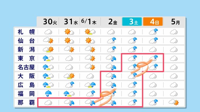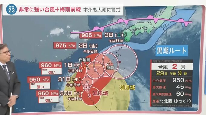 30日(火)~6月4日(日)にかけては風も強くなりますので、特に今週末は大雨、風、黒潮ルート、沿って台風2号が進んでいくことにも注意しないといけません。