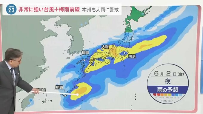 そこで雨の予想ですが、6月2日(金)夜には、本州も大雨、そして台風の近いところはもちろん大雨。