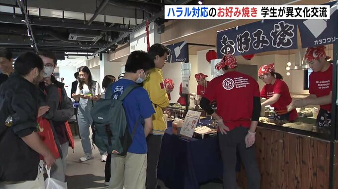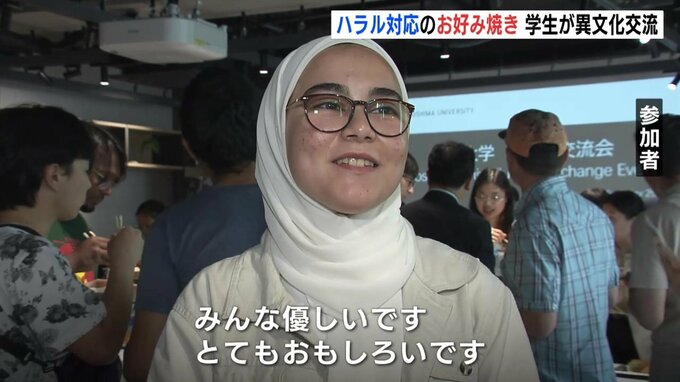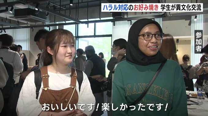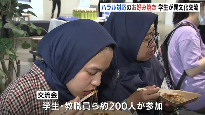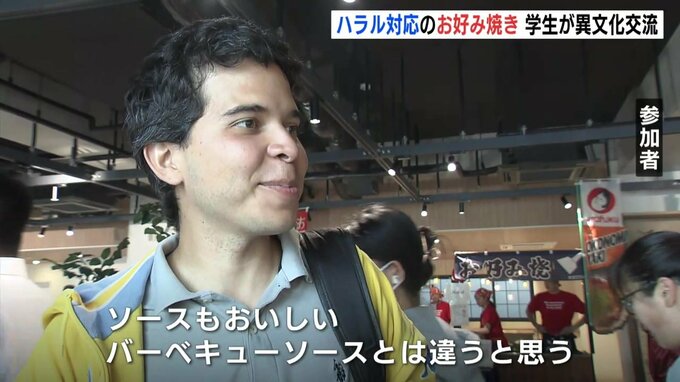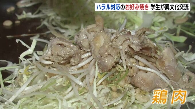 参加者たちにふるまわれたお好み焼き…。豚肉ではなく、特別な鶏肉が使われています。多くの人に参加してもらうため、「ハラル」というイスラム教の教えにのっとったお好み焼きです。
