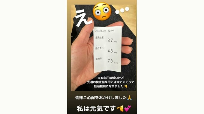 辻さんは自身のインスタグラムのストーリー機能に、検査結果の画像をアップし「え… まあ血圧は低いけど 先週の検査結果的には大丈夫そうで 経過観察になりました」「皆様ご心配をおかけしました 私は元気です」と綴りました。