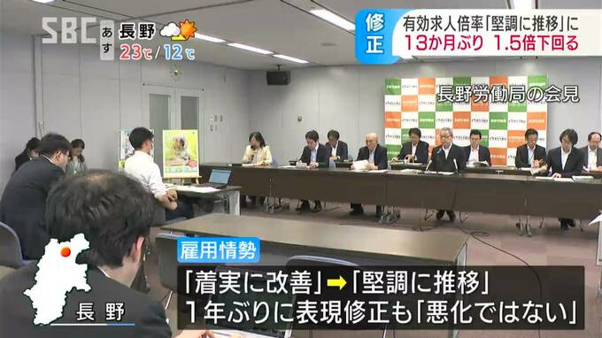 長野労働局は雇用情勢は「堅調に推移」と1年ぶりに表現を修正しています。