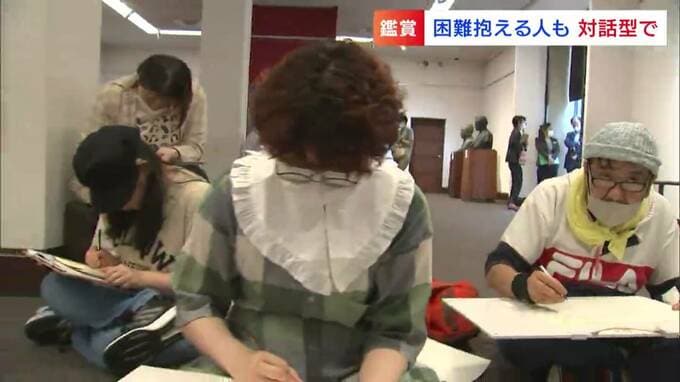 障害や病気など、困難を抱えたアーティストたちが、休館日の大原美術館を訪れました。他の入館者を気にせず、展示物から感じたことを話し合う対話型鑑賞を行い、作品制作につなげます。(参加者)「モネはこの睡蓮…