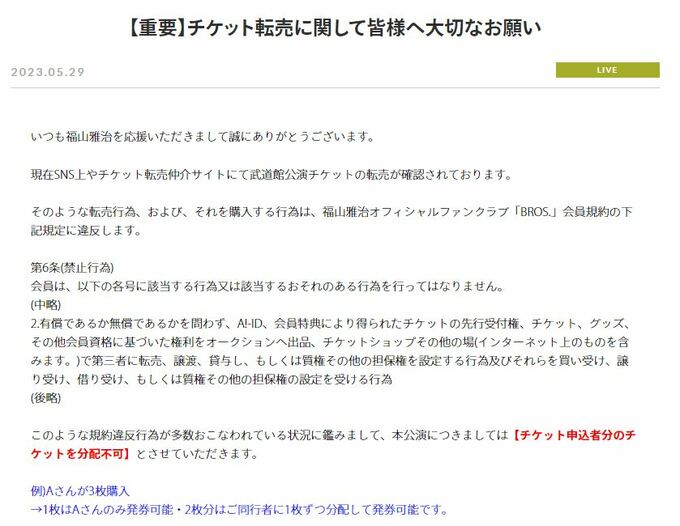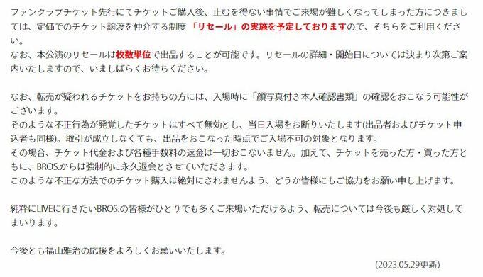 また、『転売が疑われるチケットをお持ちの方には、入場時に「顔写真付き本人確認書類」の確認をおこなう可能性がございます。そのような不正行為が発覚したチケットはすべて無効とし、当日入場をお断りいたします(出品者およびチケット申込者も同様)。取引が成立しなくても、出品をおこなった時点でご入場不可の対象となります。その場合、チケット代金および各種手数料の返金は一切おこないません。加えて、チケットを売った方・買った方ともに、BROS.からは強制的に永久退会とさせていただきます。」として、転売に関わった人たち全てへの厳しい対応をおこなうことを明らかにしています。