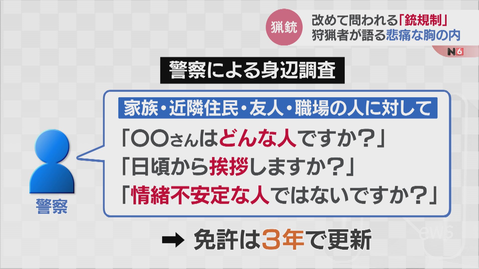銃所持の免許取得は、講習や射撃場での教習のほか、警察による身辺調査が行われます。家族はもちろん近所の人や会社の上司にいたるまで、広範囲にわたって行われ、『普段の生活態度』や『夫婦仲』など、銃を持つにふさわしい人間かどうか、聞き取ります。免許は3年の更新制で、毎回、身辺調査が行われます。