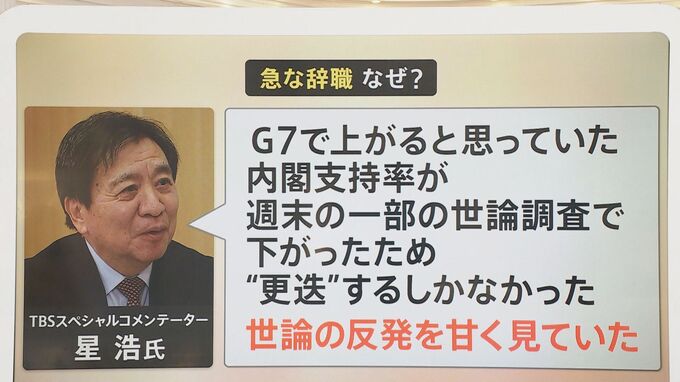 TBSスペシャルコメンテーターの星浩さんは「G7で上がると思っていた内閣支持率が、週末の一部の世論調査で下がったため“更迭”するしかなかった。世論の反発を甘く見ていた」と話しています。
