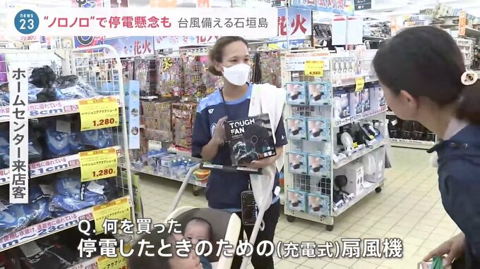 「停電ですね。(Q.何を買った?)停電したときのための(充電式)扇風機。赤ちゃんがいるので暑さ対策で。3か月と5歳。(Q.食べ物は?)1週間前からカップラーメンとか段ボール買いして、冷凍食品はまとめ買いして備えている」