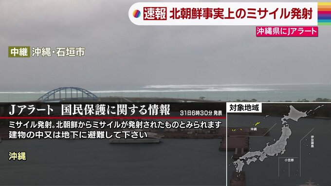 Jアラート:ミサイル発射、北朝鮮からミサイルが発射されたものとみられます。建物の中又は地下に避難して下さい。対象地域:沖縄