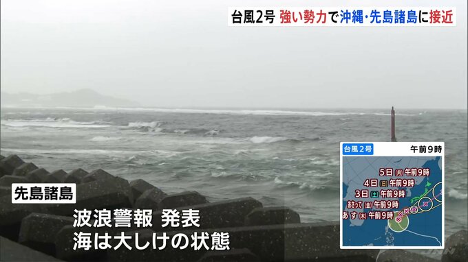 大型で強い台風2号は勢力を保ったまま、沖縄の先島諸島に接近しています。暴風や大雨に厳重な警戒が必要です。台風2号は先島諸島の南を強い勢力を保ったまま、ゆっくりと北上しています。先島諸島には現在、波浪警…