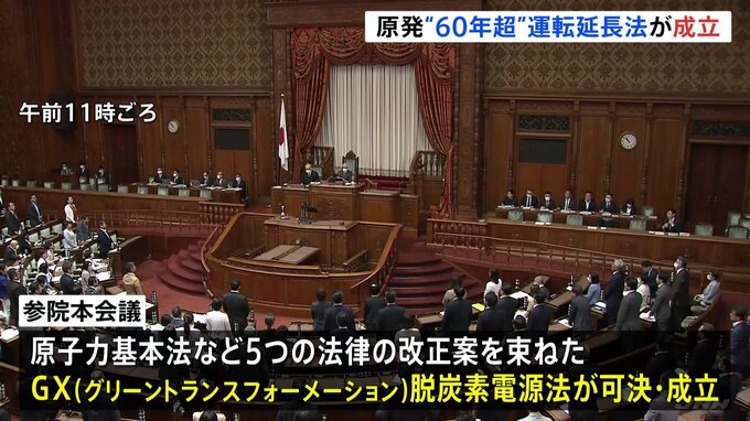 2011年の福島第一原発事故以来の政策転換です。60年を超える原発の運転延長を可能にする法案が参議院本会議で可決され、成立しました。参議院の本会議で可決・成立したのはGX=グリーントランスフォーメーション、…