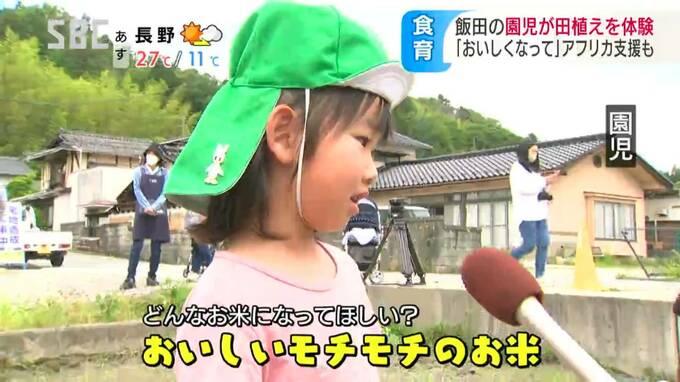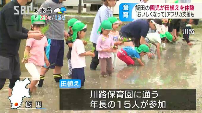 飯田市川路(かわじ)で行われた田植えには、近くの川路保育園に通う年長の15人が参加しました。