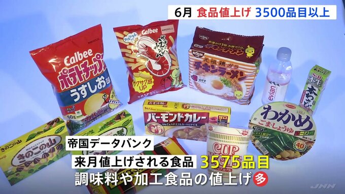 あすから6月です。6月の食品の値上げは3500品目を超えていて、カップ麺や調味料などが値上がりします。帝国データバンクによりますと、6月に値上げされる食品は3575品目で、調味料やカップ麺など加工食品の値上げ…