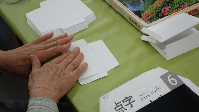 事業所の利用者は、全盲、弱視など障害の程度は様々ですが、見え方で作業を区別することはなく、さまざまな補助具を使って誰でも作業できるよう工夫しているそうです。たとえば紙を折る補助具、紙とのコントラストをはっきりさせる黒い板などの補助具を使ってみなさん、同じ作業をされていました。