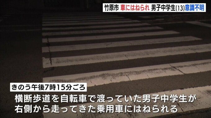 事故があったのは、竹原市港町4丁目の国道185号です。警察によりますと、31日午後7時15分ごろ、横断歩道を自転車で渡っていた男子中学生が、右側から走ってきた乗用車にはねられました。