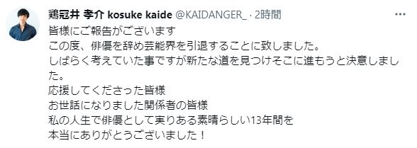 1日、俳優の鶏冠井孝介(かいで・こうすけ)さん(36)が自身のツイッターを更新し、芸能界を引退すると発表しました。