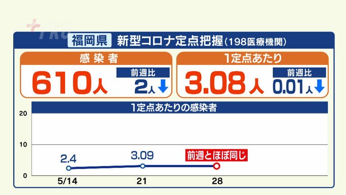 新型コロナウイルスの「定点把握」による感染状況です。福岡県内で先週1週間に、指定された医療機関から報告された感染者は1医療機関あたり3.08人で、前の週とほぼ同じでした。◆1医療機関あたり3.0…