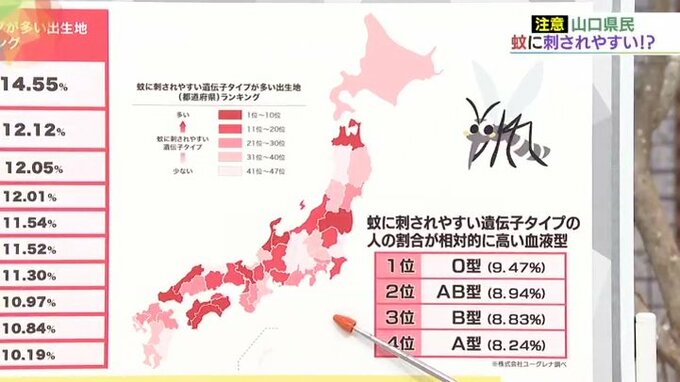 「山口県民の方がO型が多いかどうかというのは、この結果だけだとまだわからないんですけれども、少なくとも、この蚊に刺されやすい遺伝子を持っていらっしゃる方が、相対的に他の都道府県の方よりも多く山口県にはいらっしゃるということでよいかなと」