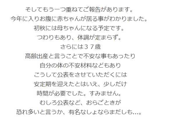 しかし、「子が入っているお腹は愛おしいです。日々大きくなるお腹に感動しつつ 妊娠中の色んな事に気をつけながら 食い過ぎに気をつけつつ栄養摂りつつ 出産まであまり神経質にならず考えすぎず 大らかな気持ちで、笑顔で、穏やかに... そして何より無事に生まれてきてくれる事を ひたすら願い、過ごしたいと思います」と母になる喜びと、心境を綴っています。