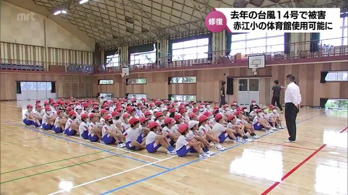 宮崎市の赤江小学校の体育館は去年の台風14号で被害を受け、使えない状態が続いていました。その体育館の修復工事が終わり、1日から使えるようになりました。去年9月、台風14号の影響で被害を受けた赤江小学校の体…