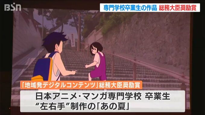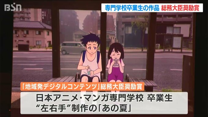 また、1日は信越地域の電波利用及び情報通信の発展に貢献した団体や個人が表彰されました。この中で新潟市の日本アニメ・マンガ専門学校の卒業生の2人『左右手(さゆうて)』さんが制作した動画「あの夏」が「地域発デジタルコンテンツ」総務大臣奨励賞を受賞しました。