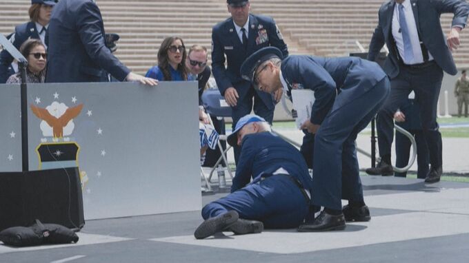 アメリカのバイデン大統領が空軍士官学校の卒業式でつまずいて転倒しました。バイデン大統領は1日、空軍士官学校の卒業式に出席し、卒業証書の授与が終わり、退場しようとした際、つまずいて転倒してしまいました…