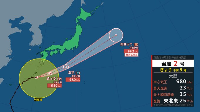 台風2号はこのあと、日本の南の海上を北東へ進んでいく予想です。ただ、大型の台風ということもあって台風の中心が離れつつあっても、沖縄や奄美では強い風や高波にお気をつけください。