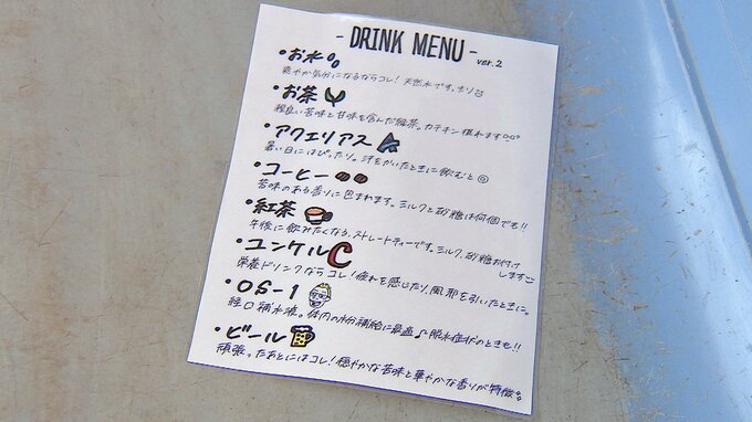 手作りのメニューにはかわいらしいイラスト入りで、水やお茶、さらには、あの栄養ドリンクや、ビールも書かれていました。その心遣いにイチローさんは・・・。