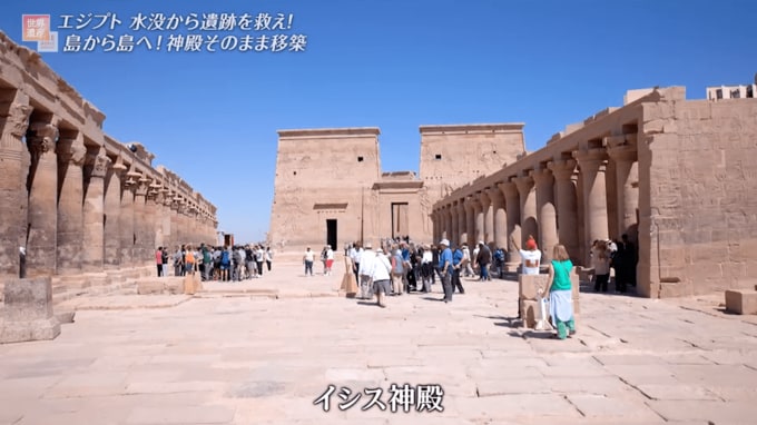 フィラエは「ナイルの真珠」と呼ばれた島の名前で、女神イシスを祭った神殿が建っていました。移築前の映像を見ると、2000年以上前に作られた貴重な神殿が水浸し・・・そのためイシス神殿は近くの他の島にまるごと移されたのです(移築後、島の名前もフィラエ島に改名)。かつてあった島は、ダムの建設によって今では島ごと水没してしまっています。