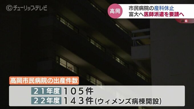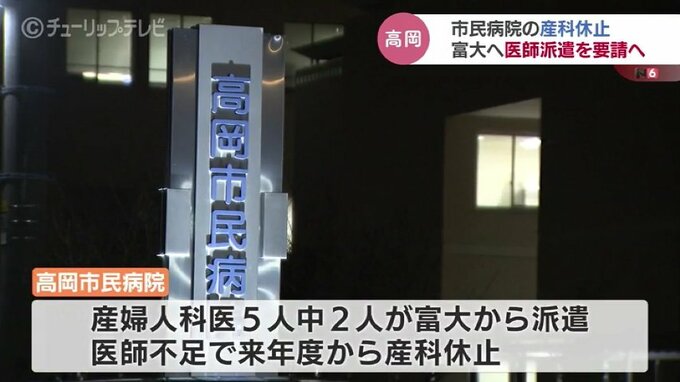 高岡市民病院は、産婦人科医5人のうち2人が富山大から派遣されています。医師不足で派遣の停止が決まり、来年度から産科の休止を余儀なくされました。
