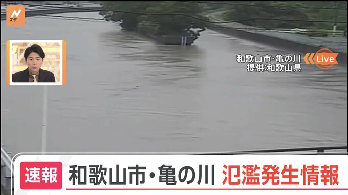 和歌山市・亀の川で氾濫が発生しました。濁流が流れているのが分かります。川の状況を見に行くのは危険です。和歌山県では一部で警戒レベル5の緊急安全確保が発表されています。