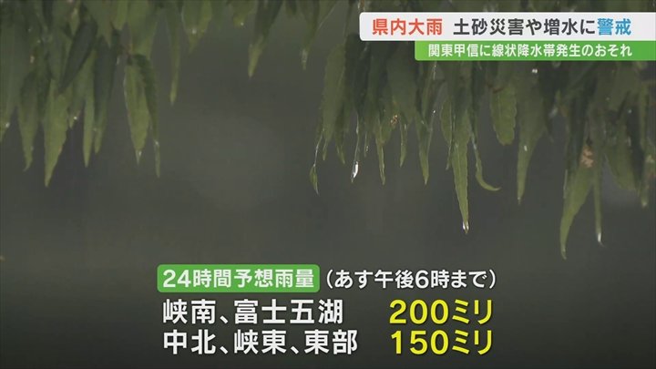雨はこのあと非常に激しく降るところがある見込みで、3日午後6時までの24時間予想降水量は峡南と富士五湖で200mm、中北、峡東、東部で150mmとなっています。