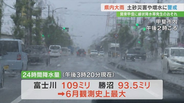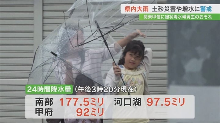午後3時20分現在の24時間降水量は南部で177.5mm、河口湖で97.5mm、甲府で92mmなどとなっています。