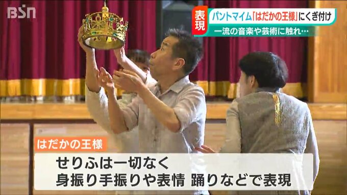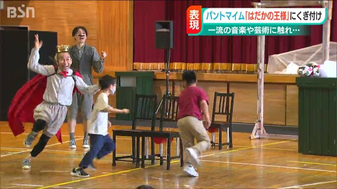 新潟市立亀田東小学校の4年生を対象に上演された「はだかの王様」。せりふは一切なく、身振り手振りや表情、踊りなどで表現するパントマイムによる劇です。
