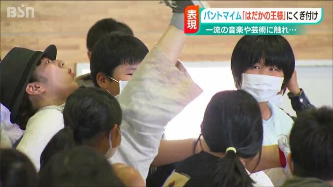 新潟市江南区の小学校でプロによるパントマイムの劇が上演され、子どもたちは言葉を使わずに表現する力に釘付けとなりました。