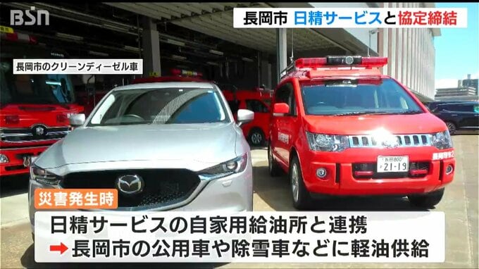 大雪や大雨、地震などの災害が発生した場合、日精サービスの会社敷地内に設置されている給油施設=自家用給油所と連携して、長岡市が公用車として導入しているクリーンディーゼル車や、除雪車などに軽油を供給できる体制を作ります。