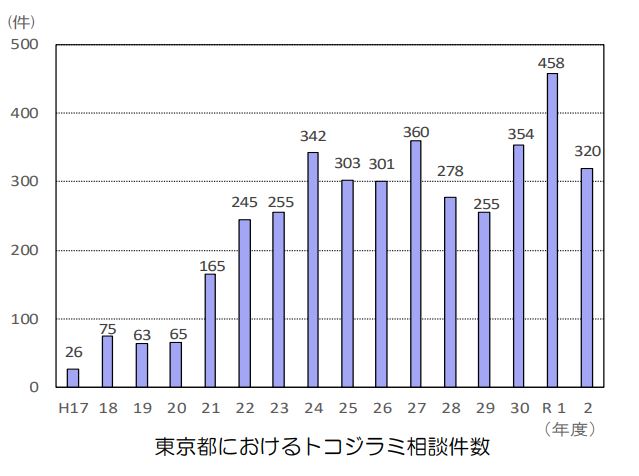 しかし、トコジラミに関する相談件数は急増しています。2005年(平成17年)に東京都に寄せられた件数は26件でしたが、2018年には354件、2019年には458件、2020年には320件となっています。