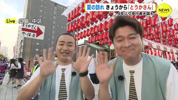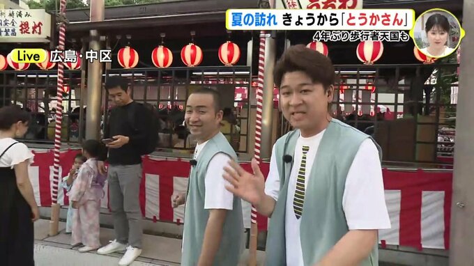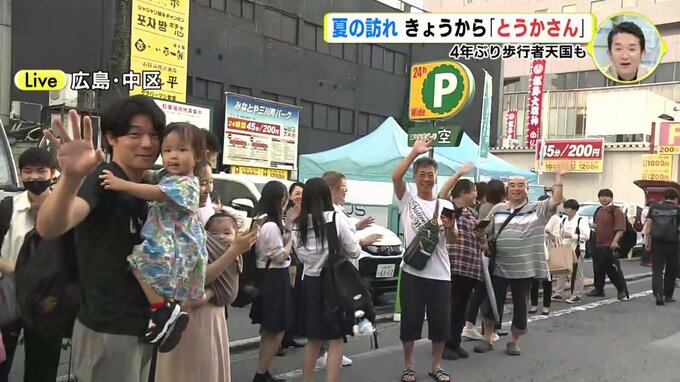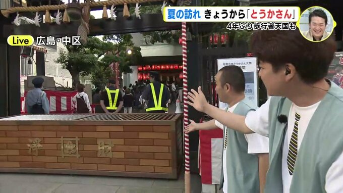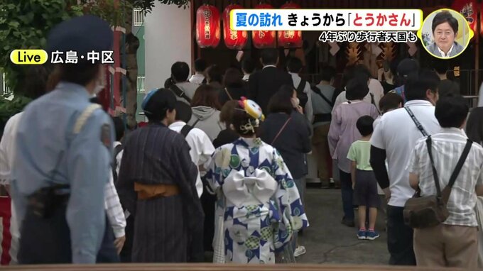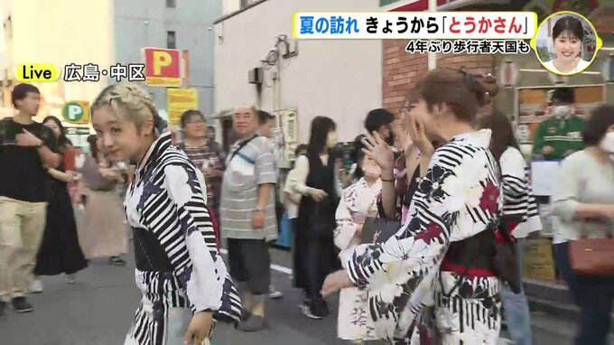 われわれ、広島市中区にあります中央通りの方にやってきております。きょうから3日間、開催されるとうかさんの模様をお送りしたいなと思っているんですが、見てください。たくさんの人です。