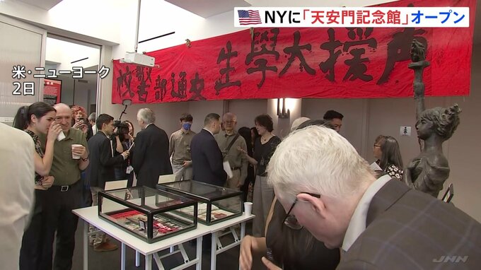 中国で民主化を求める学生らを軍が弾圧した天安門事件から、あすで34年を迎えるのを前に、アメリカ・ニューヨークで記念館の開館式が行われました。事件を今に伝える、数々の資料。この大学の旗は、学生の傷を止血…