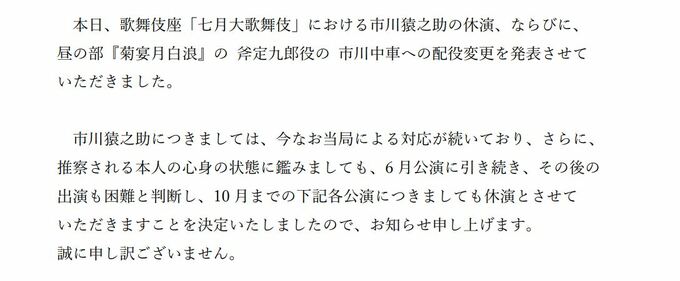 また、それ以降の公演についても「市川猿之助につきましては、今なお当局による対応が続いており、さらに、推察される本人の心身の状態に鑑みましても、6月公演に引き続き、その後の出演も困難と判断し、10月までの下記各公演につきましても休演とさせていただきますことを決定いたしましたので、お知らせ申し上げます」と発表しました。