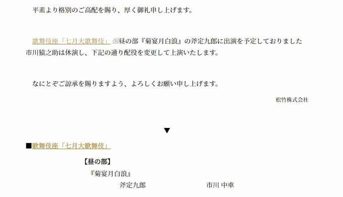 松竹は『歌舞伎座「七月大歌舞伎」昼の部 市川猿之助 休演のお詫びと配役変更のお知らせ』と題し、「歌舞伎座「七月大歌舞伎」昼の部『菊宴月白浪』の斧定九郎に出演を予定しておりました市川猿之助は休演し、下記の通り配役を変更して上演いたします」とし、「七月大歌舞伎」の昼の部「菊宴月白浪」の斧定九郎役を市川中車さんが務めるとしています。