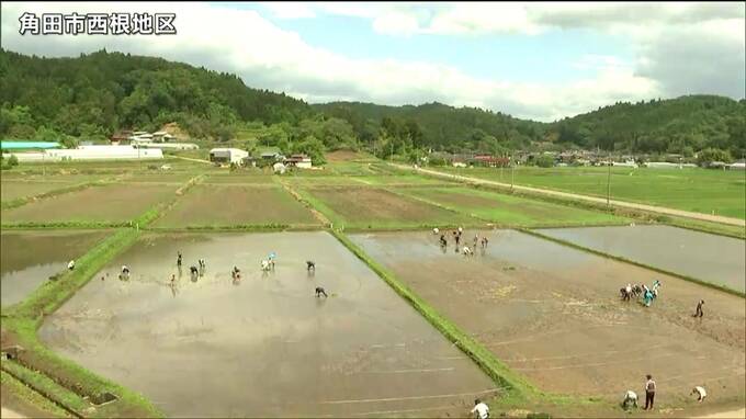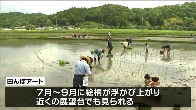 水田をキャンバスに、色とりどりの稲穂で絵を描く「田んぼアート」をつくるため3日、宮城県角田市で田植えが行われました。