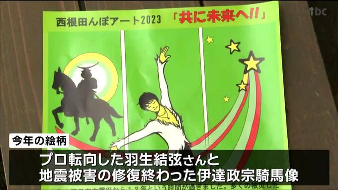 この田んぼアートは、地域おこしを目的に17年前から行われています。今年の絵柄は、プロに転向したフィギュアスケートの羽生結弦さんと去年の地震による被害の修復が終わった伊達政宗の騎馬像です。