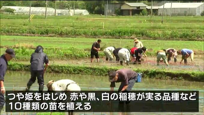 縦横70mの絵柄の輪郭に張られたテープに沿って、つや姫をはじめ、赤や黒、白の稲穂が実る品種など10種類の苗を一本ずつ植えていきました。